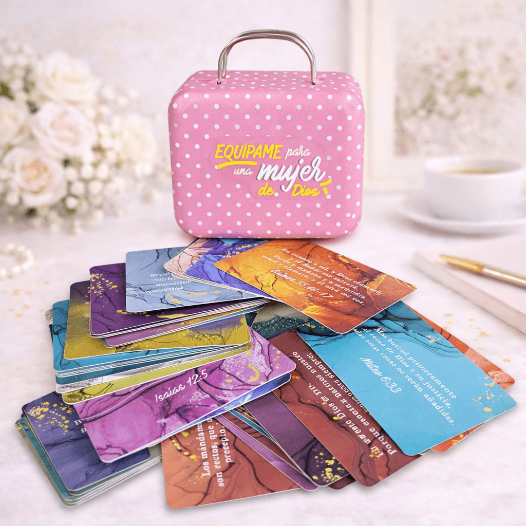 La caja metálica presenta un diseño femenino, elegante y delicado, perfecta para conservar las tarjetas, llevarlas contigo o regalar a una mujer especial. En el reverso de cada tarjeta encontrarás espacio para escribir una dedicatoria personalizada, convirtiéndolo en un regalo cristiano significativo y lleno de amor.