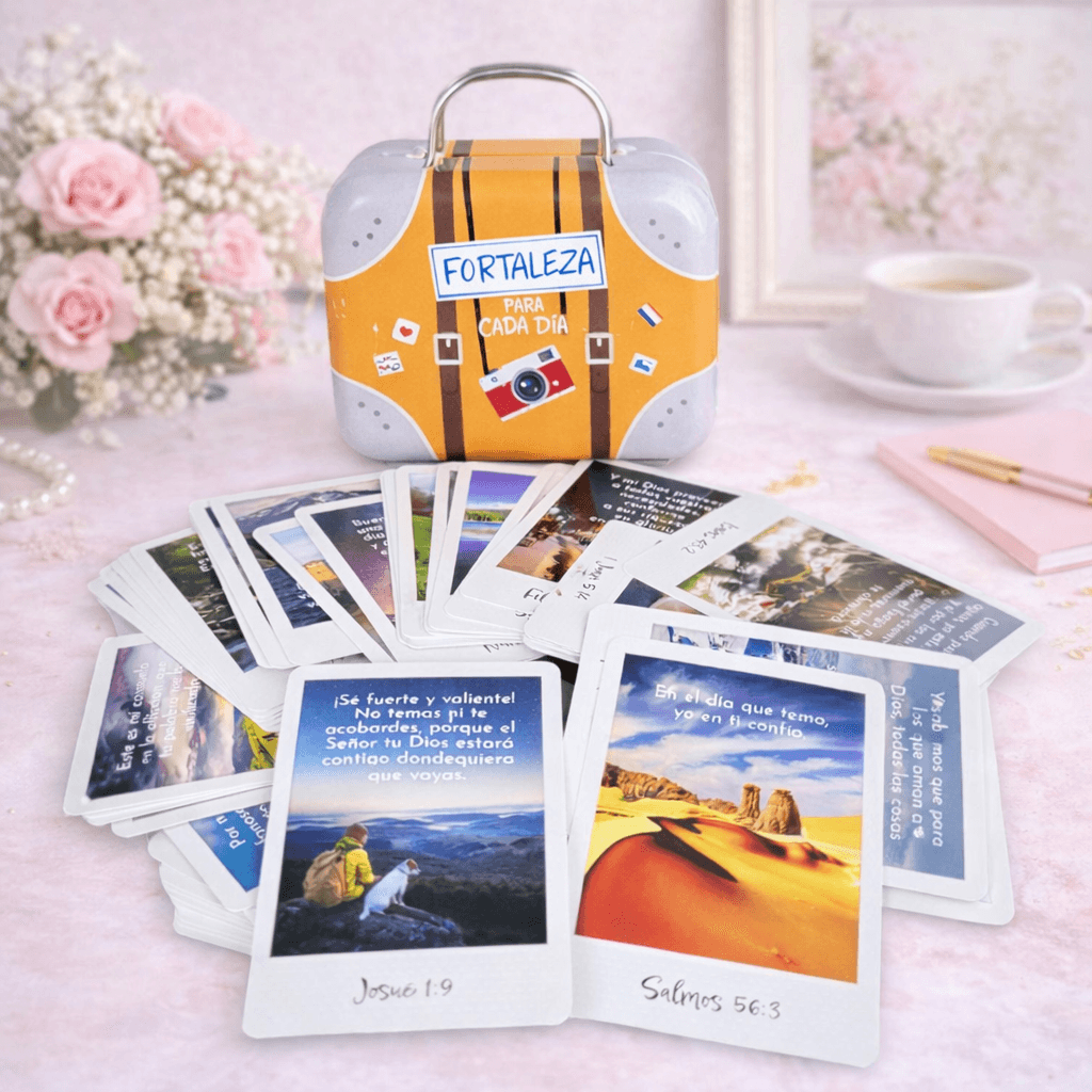 La caja metálica tiene un diseño hermoso, resistente y significativo, perfecta para conservar las tarjetas, llevarlas contigo o regalarlas a alguien especial. Cada tarjeta presenta un versículo inspirador y en el reverso encontrarás espacio para escribir una dedicatoria personalizada, convirtiéndolo en un regalo cristiano lleno de propósito.