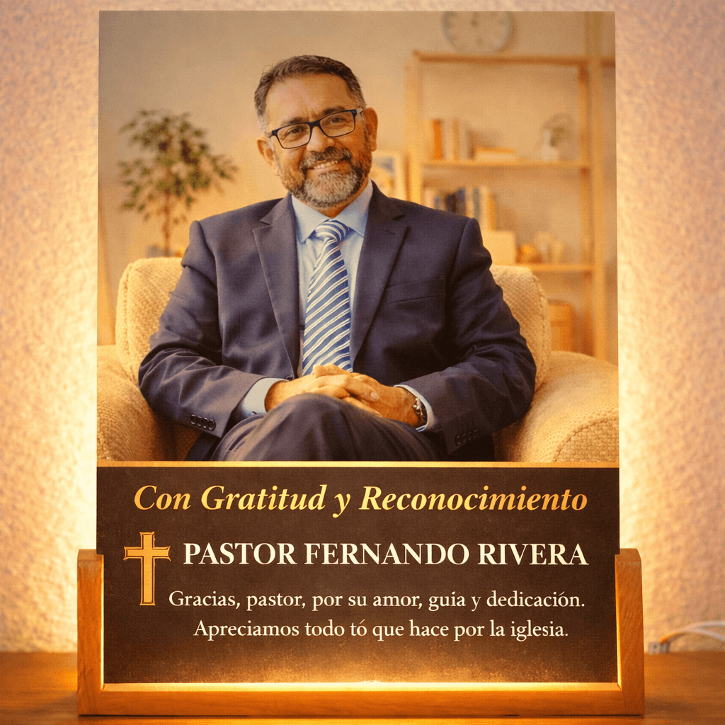Honra y reconoce a tu pastor o líder espiritual con una placa elegante, iluminada y completamente personalizada. Ideal para aniversarios ministeriales, Día del Pastor y eventos especiales.
