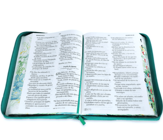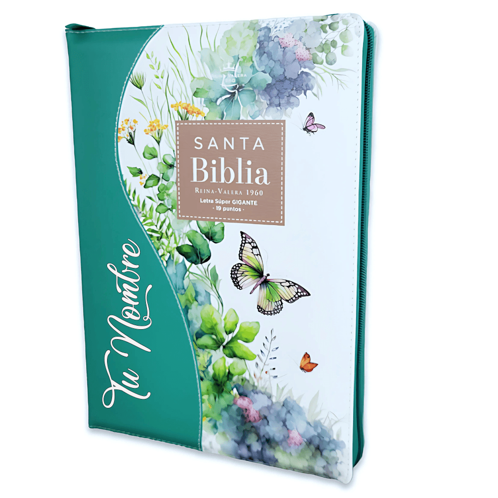 Biblia Verde floral mariposa con índice y canto floral Letra Súper Gigante 19 puntos RV1960 con Cierre imit. piel