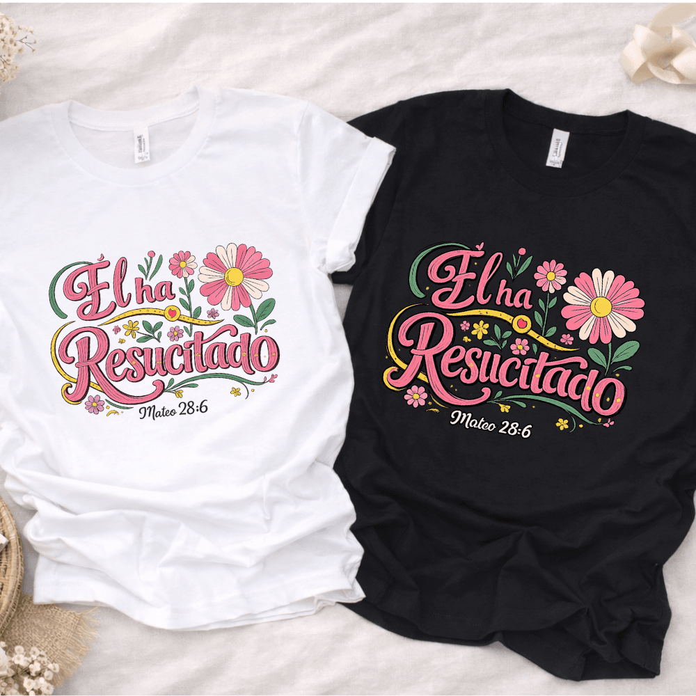Con un estilo floral vibrante, delicado y lleno de alegría, esta pieza transmite esperanza, vida y la promesa eterna de Cristo. Los detalles en tonos rosados, verdes y amarillos resaltan maravillosamente sobre playeras o sudaderas negras, creando un look elegante y lleno de significado.